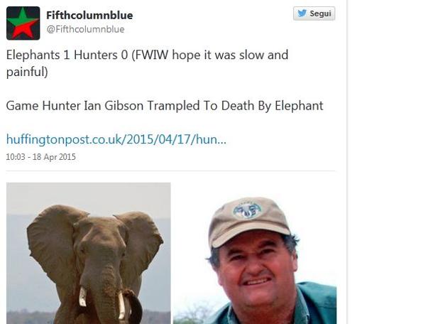 ROMA -. Un elefante vede un gruppo di cacciatori intenti a seguire le tracce di un leone e parte alla carica. La guida del safari, il cacciatore professionista Ian Gibson spara col fucile senza riuscire a fermare il pachiderma che prosegue la sua corsa travolgendolo ed uccidendolo. E’ accaduto mercoledì in una zona selvaggia dello Zimbabwee da quel momento, dopo la diffusione della notizia, sul web è partita la corsa all’assoluzione dell’animale che a detta di molti utenti dei social network avrebbe agito per “legittima difesa”. Tra i tanti commento, c’è addirittura chi esulta per la morte dell’uomo.