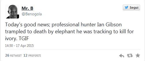 ROMA -. Un elefante vede un gruppo di cacciatori intenti a seguire le tracce di un leone e parte alla carica. La guida del safari, il cacciatore professionista Ian Gibson spara col fucile senza riuscire a fermare il pachiderma che prosegue la sua corsa travolgendolo ed uccidendolo. E’ accaduto mercoledì in una zona selvaggia dello Zimbabwee da quel momento, dopo la diffusione della notizia, sul web è partita la corsa all’assoluzione dell’animale che a detta di molti utenti dei social network avrebbe agito per “legittima difesa”. Tra i tanti commento, c’è addirittura chi esulta per la morte dell’uomo.