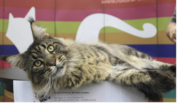 ROMA – E’ stato Felix Coon Titanic, il gatto pluridecorato, neo campione del mondo 2015, tre anni e mezzo per 11 chili di peso, il Maine Coon più grande del mondo per lunghezza, altezza e imponenza, la star del SuperCatShow 2015, la due giorni di evento nella Fiera di Roma, con più di 800 felini per oltre 20 razze dei migliori allevamenti mondiali su un palco di oltre 50 metri, in un padiglione di oltre 10.000 metri quadrati, il più grande della Fiera. “Padrino d’eccezione” dell’evento, riferisce l’organizzazione, Felix Coon Titanic che ha vinto il titolo mondiale domenica25 ottobre a Malmo, in Svezia, tra gli oltre mille gatti della categoria a “pelo semilungo”.