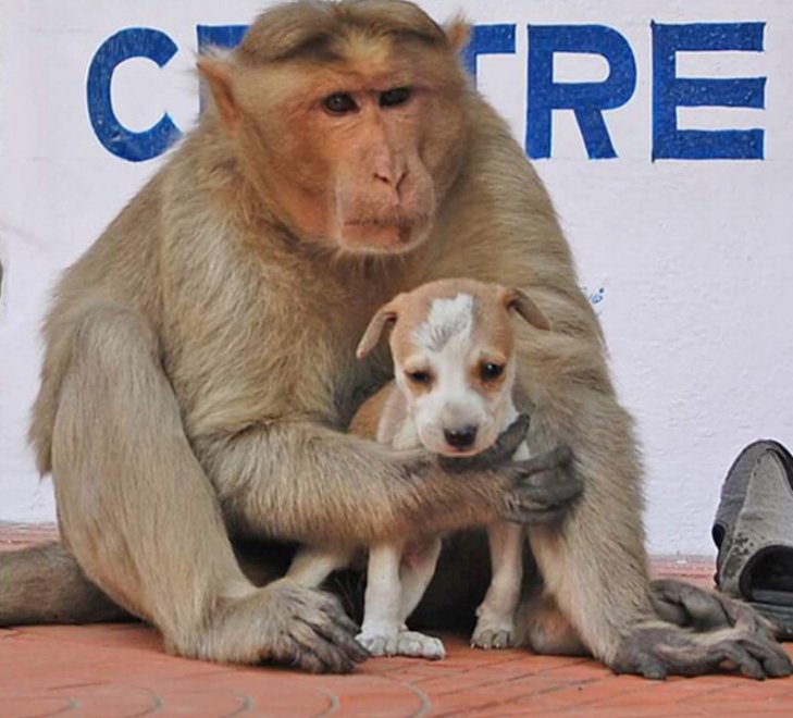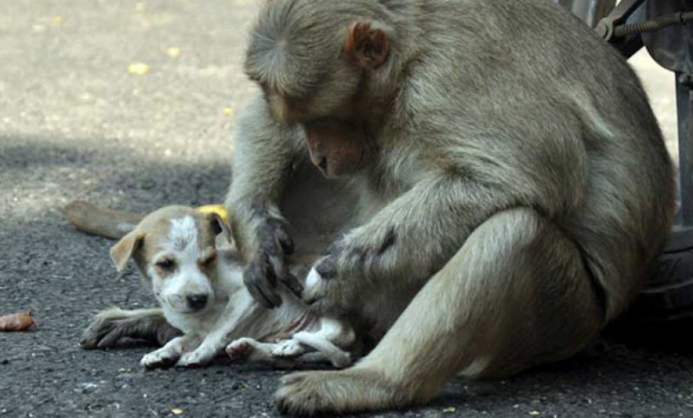 Il cane, dopo essere scampato dall’attacco di un altro cane come mostra una delle foto che seguono, ha cominciato a vivere in strada pur non essendone affatto preparato. Il macaco più vecchio di lui, dopo averlo salvato ha deciso di adottarlo dopo averlo preso in simpatia. Le immagini che seguono sono state scattate in un’affollata strada indiana: i passanti che hanno assistito alla scena ne sono rimasti colpiti da mettere subito a disposizione del cibo per i due amici.