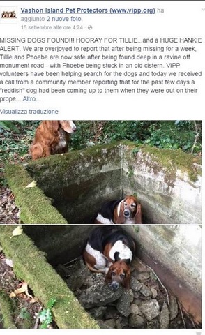 WASHINGTON – Phoebe e Tillie, un basset hound e un setter, erano scomparsi da circa una settimana. I due cani, dopo tante ricerche sono stati trovati insieme. Phoebe era caduta in una vecchia cisterna che si trova in un bosco ed era ferita. Tillie, il setter, era rimasto fuori sul bordo della cisterna di cemento, a vegliarla. Questa storia di amicizia tra due cani è stata raccontata dal Daily Mail: Phoebe e Tillie erano scomparsi da casa e per ritrovali era stato pubblicato un annuncio sulla pagina Facebook della Vashon Island Pet Protectors, organizzazione Usa dello Stato di Washington che si occupa di tutela degli animali.