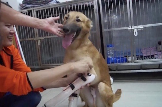 Il cane è stato operato in una clinica di Bangkok. Il cane ha ricevuto le protesi e si è subito alzato in piedi scodinzolando contento. Non emozionarsi vedendo questo video è impossibile. Cola è stato ferito da un vicino di casa che gli ha tagliato parte delle zampe. A salvarlo in tempo è stato il suo padrone che ha denunciato il vicino responsabile dell’attacco che è stato condannato ad un mese di carcere grazie alll’Animal Welfare Act approvato nel 2014. Cola era stato gravemente ferito agli arti inferiori a maggio. In quella data, il cane aveva solo nove mesi di età e aveva morso un paio di scarpe di un vicino che aveva reagito colpendolo con una spada.