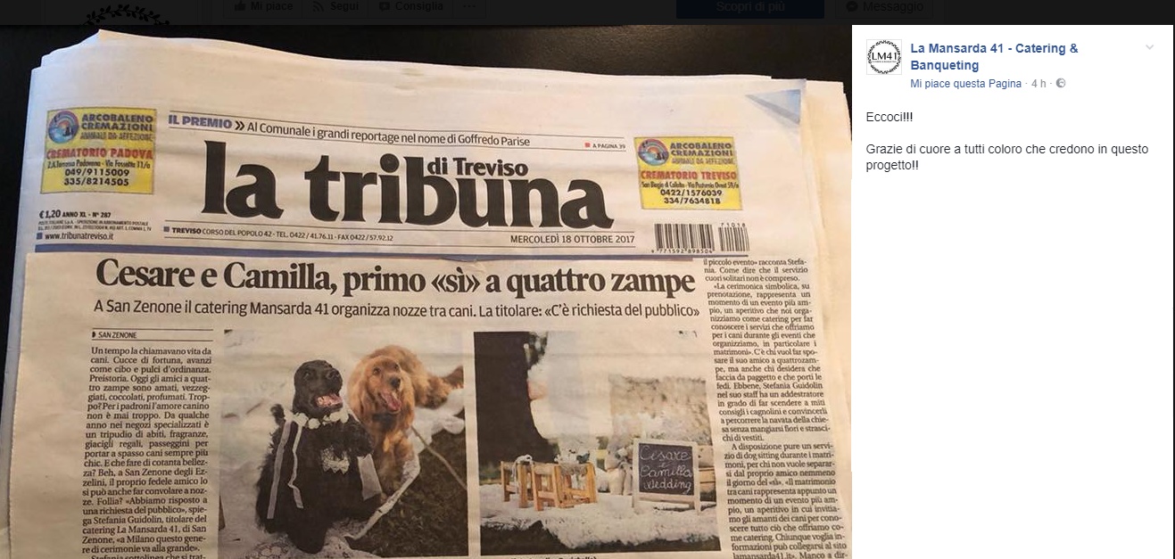 Nelle foto che seguono diffuse su Facebook, Cesare e Camilla, due bellissimi cocker si sono “sposati” grazie al nuovo servizio offerto dall’azienda “La Mansarda41”. A La Tribuna di Treviso, Stefania Guidolin, la titolare del catering La Mansarda41 di San Zenone, la stessa che ha postato le foto dell’evento, dice di aver soltanto risposto a una richiesta del pubblico aggiungendo che in città come Milano questo genere di cerimonie va alla grande da diverso tempo.