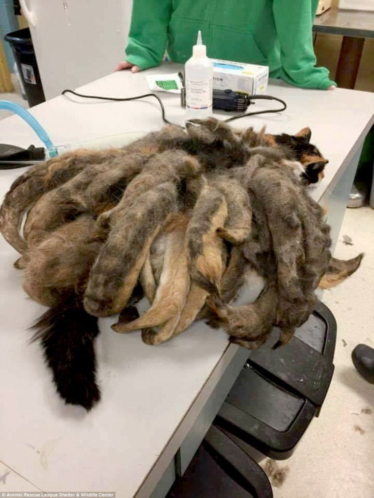 Ad Hidey sono stati tolti due chili di pelliccia. Il personale del centro ha raccontato di non aver mai visto niente del genere prima. Hidey ha 14 anni. Nella casa di Russell e di sua moglie Jill, vive anche un altro gatto, Siam, di 17 anni. Non è chiaro se anche questo secondo gatto sia stato portato via oppure no. La Western PA Humane Society ha scritto su Facebook un paio di giorni fa che i “nuovi proprietari del gatto ci hanno detto che Hidey è rimasto nascosto sotto il letto della sua nuova casa per molte. Ora inizia a stare più tranquillo ed anche a fare le fusa”.