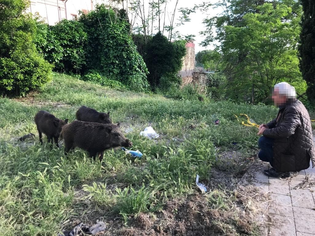 Roma, un cittadino della zona dà del cibo ai cinghiali