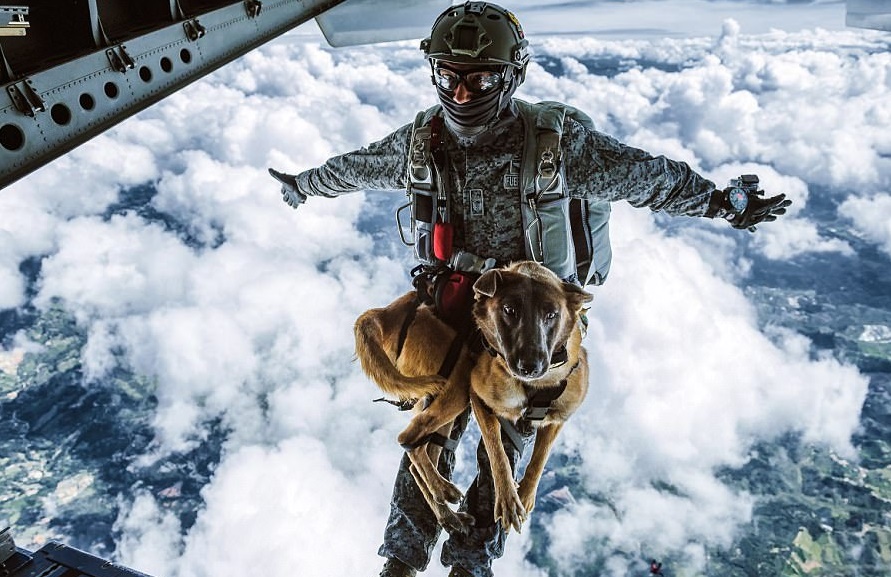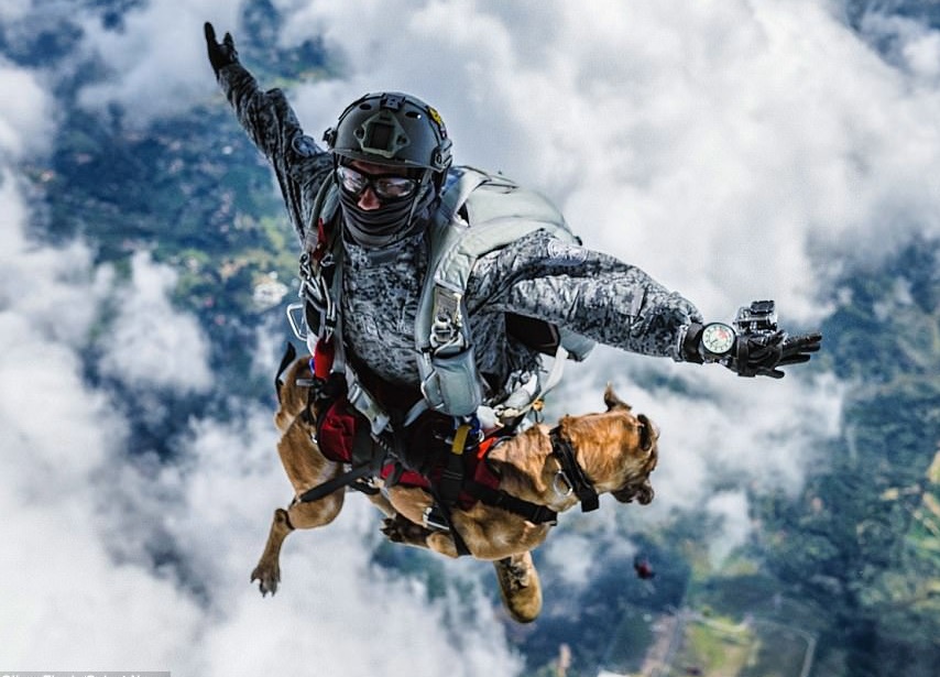 Siara è stata immortalata durante il suo quinto e ultimo salto che fa parte della sua formazione. Il fotografo ha raccontato che la coppia, alla fine dell’esercitazione, era euforica. Tutto è andato per il meglio ed ora il cane è pronto ad entrare a pieno titolo nell’aeronautica colombiana.