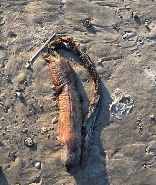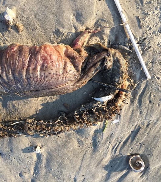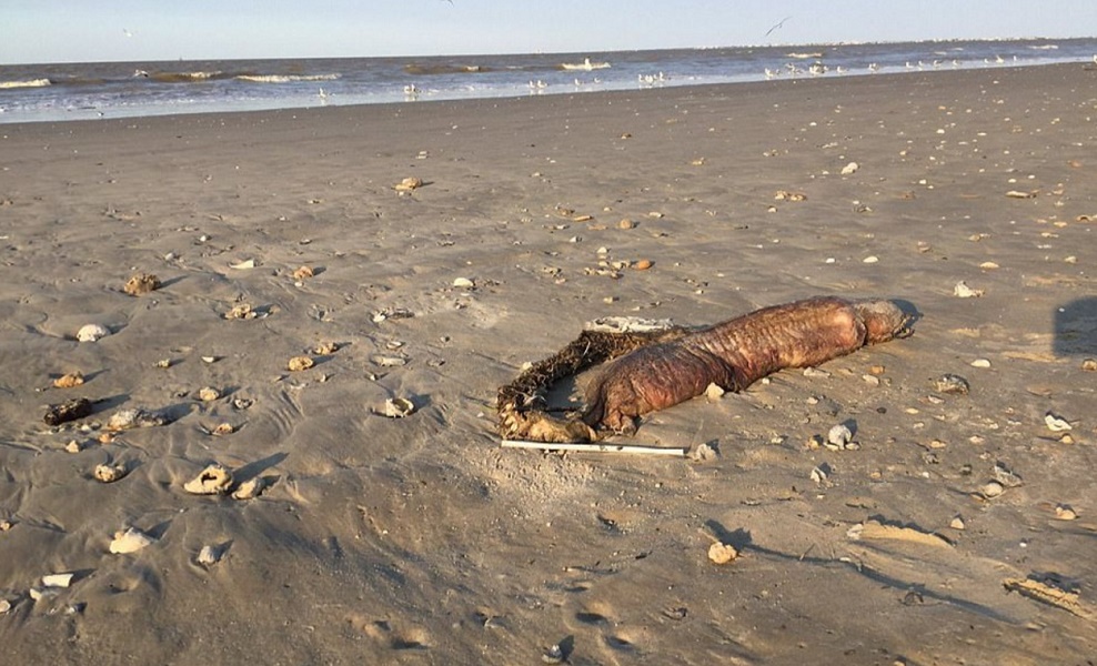 La scorsa settimana, Preeti Desai della National Audobon Society ha pubblicato su Twitter una misteriosa creatura che ha trovato su una spiaggia di Texas City dopo il passaggio dell’uragano Harvey.La ragazza ha chiesto aiuto per provare ad identificare l’animale morto, apparentemente senza occhi e che sfoggia una bocca con denti affilati e un grande corpo cilindrico.