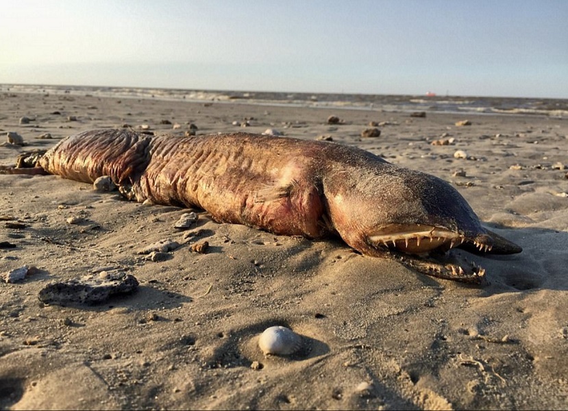 La scorsa settimana, Preeti Desai della National Audobon Society ha pubblicato su Twitter una misteriosa creatura che ha trovato su una spiaggia di Texas City dopo il passaggio dell’uragano Harvey.La ragazza ha chiesto aiuto per provare ad identificare l’animale morto, apparentemente senza occhi e che sfoggia una bocca con denti affilati e un grande corpo cilindrico.