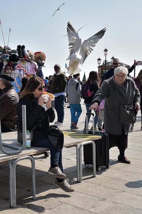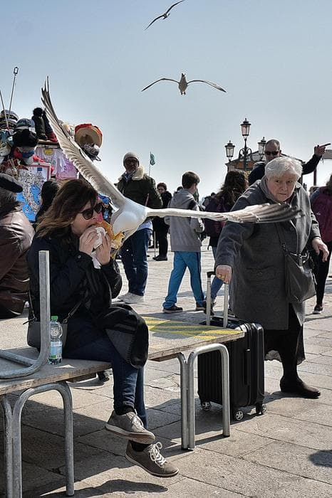 Una scena documentata dagli scatti di Maurizio Torresan, un fotografo di piazza, secondo la cui esperienza si tratta di una tecnica nuova dei gabbiani, soliti ‘planare’ sui turisti per far cadere il cibo direttamente a terra, e poi banchettare. Quello dei gabbiani molesti è un problema conosciuto, che si è tentato di risolvere in mille modi. Il loro numero è tuttavia fortemente diminuito da quando in città è partita la raccolta porta a porta dei rifiuti (foto Ansa).