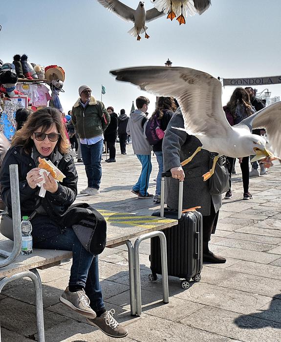 Una donna sudamericana che stava addentando un panino, seduta sulle passerelle per l’acqua in piazza San Marco, è stata ‘attaccata’ senza poter reagire da un gabbiano reale: col becco il grosso pennuto ha spezzato a metà lo snack, ancora nelle mani della donna, e senza neanche sfiorarla è poi fuggito con il bottino, lasciando la signora a bocca aperta.