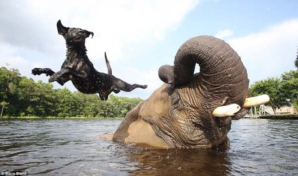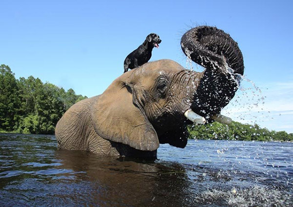 L’incontro è avvenuto al Myrtle Beach Safari, rifugio che ospita tigri e orangotanghi, lupi e scimpanzè e tutta una serie di animali salvati da morte o disagi vari. La cosa che accomuna i due animali è l’amore e la passione per l’acqua: labrador ed elefante, sguazzano felici insieme e a lungo. La cosa che colpisce è anche il fatto che l’elefantessa di 3 tonnellate si muove con estrema cautela intorno alla sua piccola amica, che per tutto il tempo del continua a correrle intorno.