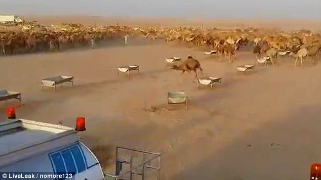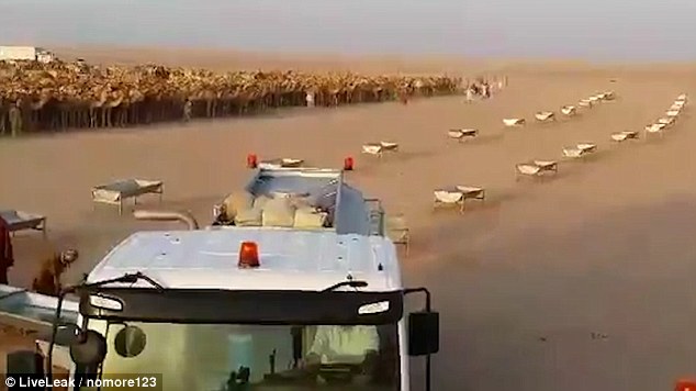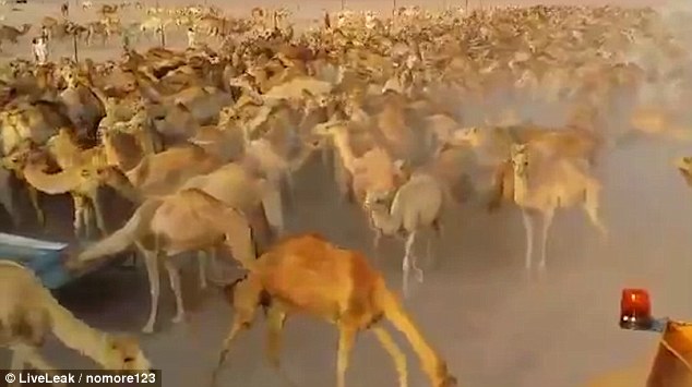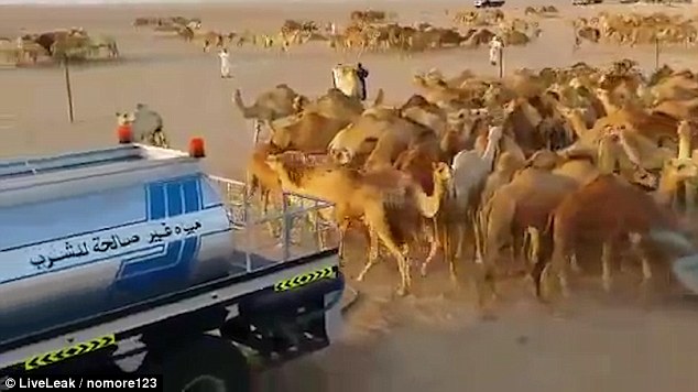 I cammelli possono bere fino a 30 litri di acqua in meno di 15 minuti: gli allevatori che li curano, come mostra il video postato sul Daily Mail, li fa andare agli abbeveratoi un gruppo alla volta. Quando gli animali corrono a dissetarsi, in cielo si alza una nuvola di polvere.