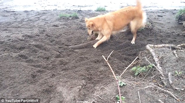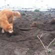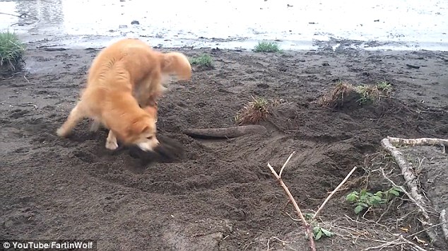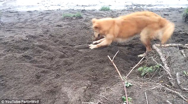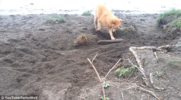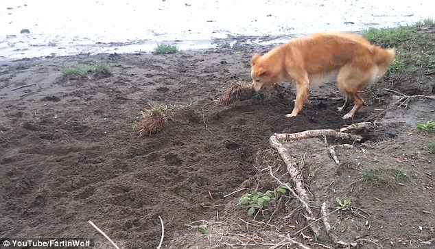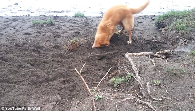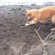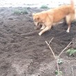 Il suo proprietario osserva il cane che riesce a sollevare solo un po’ di fango e ride. Il cane continua intanto a correre avanti indietro e finisce per annullare tutto il lavoro riscoprendo il bastone che viene riportato alla luce tutto sporco di fango.