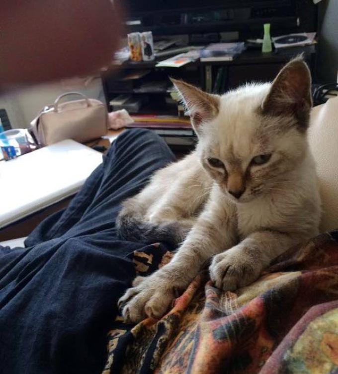 Il giovane se l’è ritrovata appesa alle scarpe e ai pantaloni come ad attirare l’attenzione di Kawasaki che alla fine si è convinto a portarsela a casa. Una volta a casa è diventata la regina del suo nuovo regno: dopo mezz’ora già era accoccolata al suo fianco. Dopo un’ora dormiva già accanto al giovane.