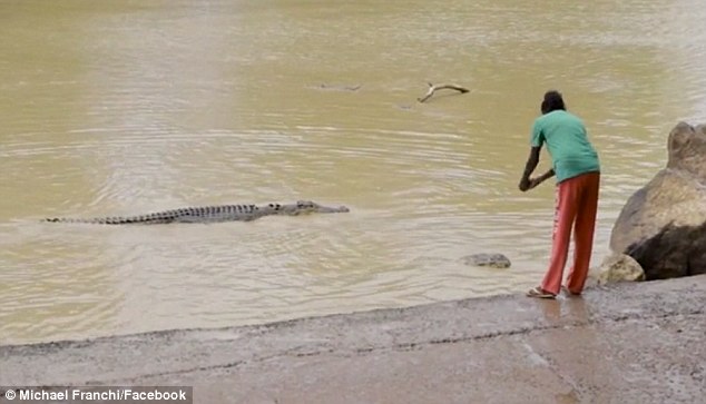 Nell’acqua torbida di un fiume, la donna vede a pochi metri di distanza un coccodrillo da acqua salata. Invece di fuggire via, la donna decide di lanciargli un bastone che lo colpisce in pieno sulla testa. Prima, la donna aveva provato senza successo ad allontanarlo battendo le mani.
