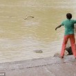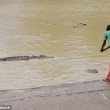 Nell’acqua torbida di un fiume, la donna vede a pochi metri di distanza un coccodrillo da acqua salata. Invece di fuggire via, la donna decide di lanciargli un bastone che lo colpisce in pieno sulla testa. Prima, la donna aveva provato senza successo ad allontanarlo battendo le mani.