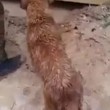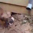 Prima di passare all’azione, mamma cane si lamenta e passeggia disperatamente accanto al padrone che sta provando a spalare il fango e l’acqua con un secchio. Il cane immerge le zampe nell’acqua per capire come riuscire a salvare i suoi piccoli. Poi annusa l’acqua e guarda in alto verso il padrone come a chiedere aiuto. Nel frattempo i suoi cuccioli continuano a piangere.