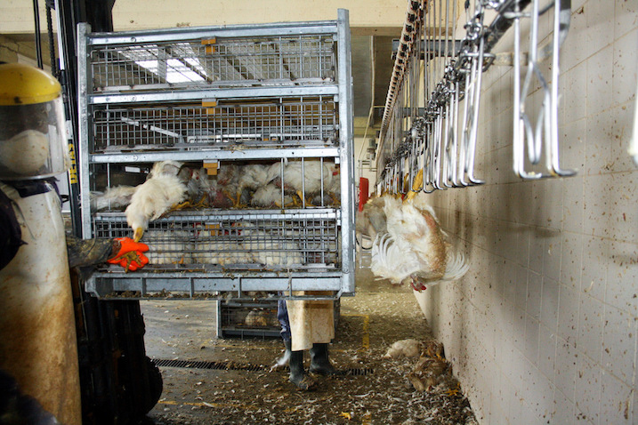 Una sorte peggiore attende gli animali che sopravvivono fino al giorno del macello: gli operatori li afferrano violentemente per le zampe, spesso procurandogli dolorose fratture, e li appendono a testa in giù su ganci di metallo. I polli, dibattendosi convulsamente nel tentativo di liberarsi, spesso sfuggono allo stordimento, che risulta così inefficace: così, ogni giorno, migliaia di polli vengono sgozzati mentre sono ancora coscienti.