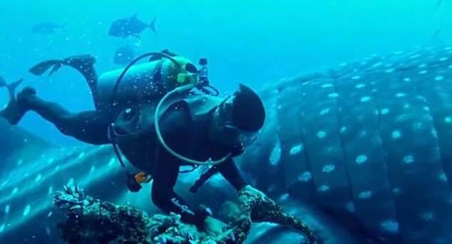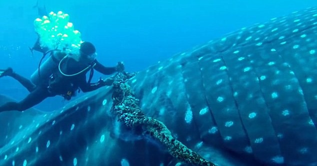 CITTA’ DEL MESSICO – YOUTUBE Squalo balena intrappolato in corda da pesca. Un sub riesce a liberare uno squalo balena intrappolato in una corda da pesca. Il video e le foto le pubblica il Daily Mail e mostrano che il sub impiega solo 30 secondi per liberare l’enorme pesce. L’enorme corda rallenta il suo corpo: il sub si trovava là per caso ed ha avvistato la balena affannata decidendo di liberarla.