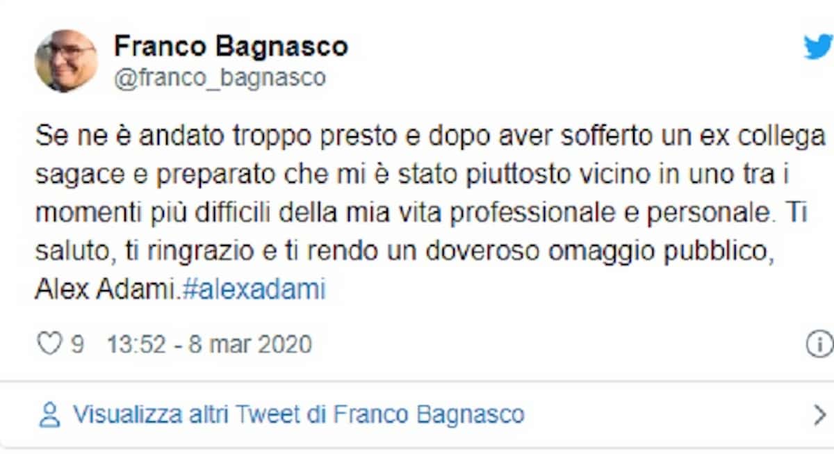 A darne notizia, con un post su Twitter, il collega Franco Bagnasco: “Se ne è andato troppo presto e dopo aver sofferto un ex collega sagace e preparato che mi è stato piuttosto vicino in uno tra i momenti più difficili della mia vita professionale e personale. Ti saluto, ti ringrazio e ti rendo un doveroso omaggio pubblico, Alex Adami.#alexadami”.