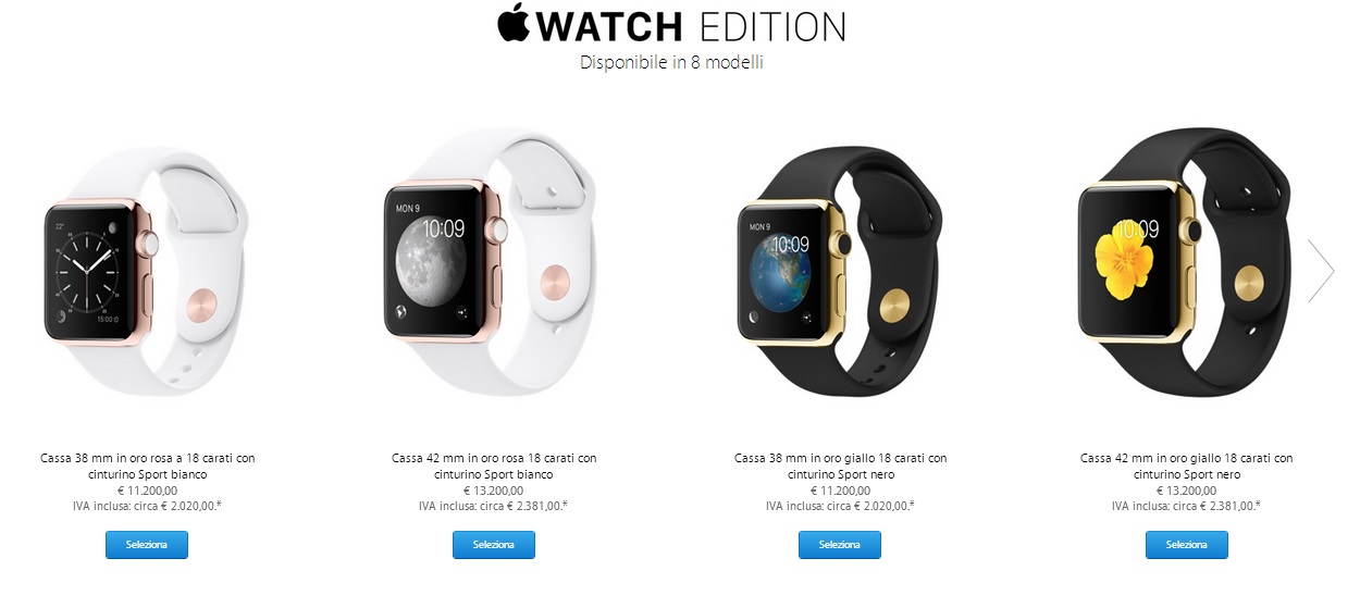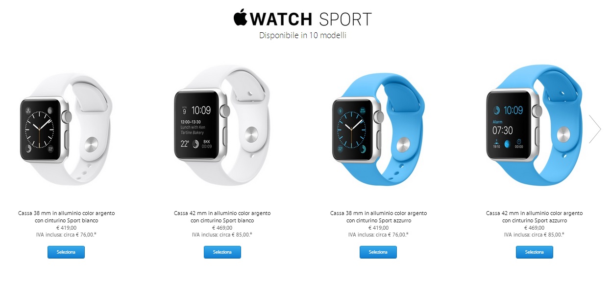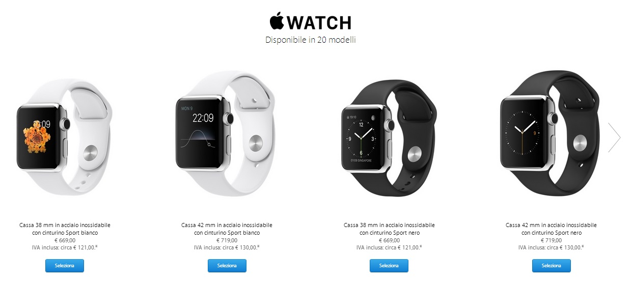 Tempi di consegna. Il modello Sport è spedito in un giorno. Altre versioni (come Apple Watch) sono spediti con tempi tra cinque giorni e due settimane. Gli Apple Watch Edition sono spediti in due o tre settimane.