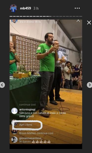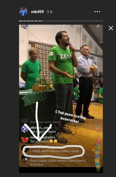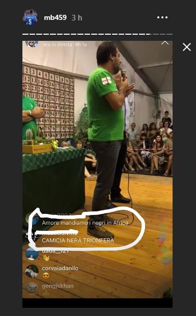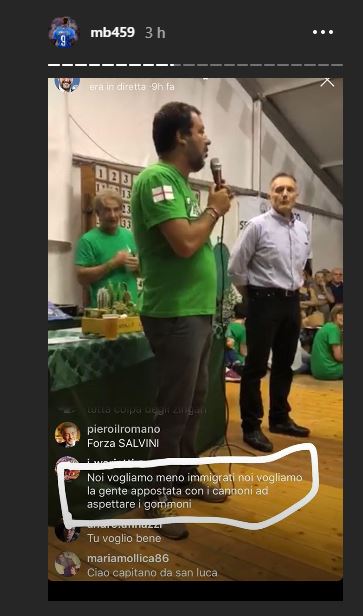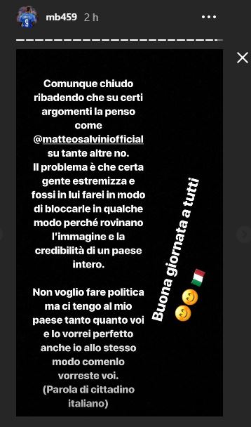 Il calciatore spezza anche una lancia a favore del leader della Lega: “Dice anche cose giuste e tocca argomenti sui quali mi trova d’accordo”. Poi chiede ai suoi follower: “Ma vorrei che commentaste voi i commenti…essere italiani cosa significa? Migliorare il paese come? Il razzismo esiste?”