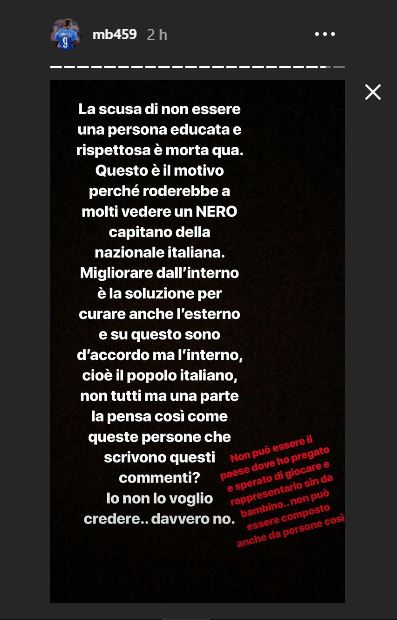 Balotelli conclude: “Non è vero che non mi vogliono perché sono una persona poco educata. Parte del popolo italiano la pensa come le persone che scrivono questi commenti. Non ci voglio credere, davvero non voglio. Non può essere il Paese dove ho pregato e sperato di giocare e che rappresento fin da bambino, non può essere fatto anche di persone così. Penso che Salvini su alcune cose abbia ragione, ma dovrebbe bloccare chi scrive certe cose perché rovinano l’immagine e la credibilità di un Paese intero. Non voglio fare politica, ma tengo al mio Paese tanto quanto voi e lo vorrei perfetto come lo volete voi, parola di cittadino italiano”.