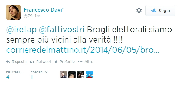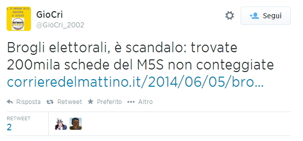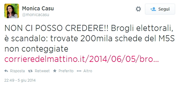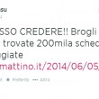 “Brogli elettorali, è scandalo: trovate 200mila schede del M5S non conteggiate”. “Ca..o, se c’era anche la mia mi arrabbio come una iena”, twitta un utente. Un altro esprime preoccupazione: “Ci sono un sacco di persone che fanno dello spirito su questa vicenda, io sarei un tantino più serio e preoccupato”. E poi: “Inizia la caccia a brogli elettorali. Lo scrivo da tempo, è successo, schede non conteggiate trovate nei cassonetti”; “Sarà verò? Se sì, c’è da chiedersi in che cavolo di paese incivile ci troviamo”; “Evvai!, ai seggi i comunisti corrotti e paraculo sanno fare solo questo, mi fanno pena sono persone incapaci”.