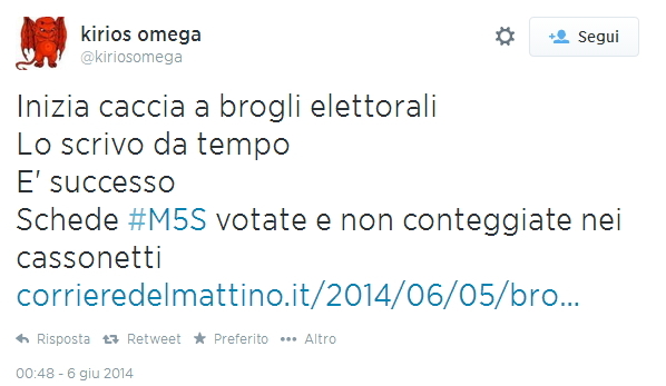 “Lo scandaloso episodio sta già circolando in rete e le autorità hanno deciso di aprire un’indagine per incastrare i colpevoli dell’accaduto, anche se sembra che l’episodio sia stato ben progettato e che gli interessi politici dietro siano dei più elevati. Per questo motivo ci sarà la possibilità di una tornata elettorale nuova e sussidiaria. Nel frattempo il Movimento 5 Stelle ha già provveduto a presentare ricorso presso la corte costituzionale europea per brogli e frode aggravata nei propri confronti. Si attendono aggiornamenti sugli sviluppi nei prossimi giorni.”