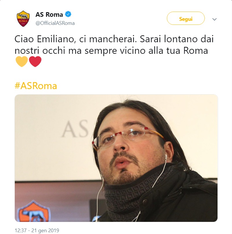 La notizia della morte del giovane giornalista ha fatto il giro del web e sono diverse le redazioni online dedicate alla Roma che lo ricordano ed esprimono cordoglio alla famiglia. Anche il club sportivo ha espresso vicinanza per il grave lutto in un messaggio su Twitter: “Ciao Emiliano, ci mancherai. Sarai lontano dai nostri occhi ma sempre vicino alla tua Roma”.
