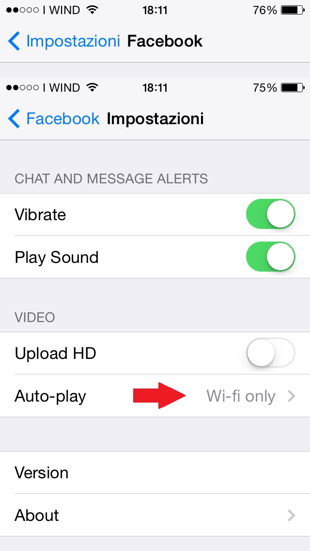 iOS (Apple): devi recarti nelle Impostazioni del dispositivo (clicca sull’apposita icona presente in basso a destra nella nome screen) e scorrere la schermata che si apre fino a quando non arrivi alla dicitura relativa a Facebook. Seleziona l’icona del social network, dopodiché pigia sul pulsante Impostazioni e sposta su ON lo switch relativo all’opzione Riproduci automaticamente video solo su Wi-Fi.