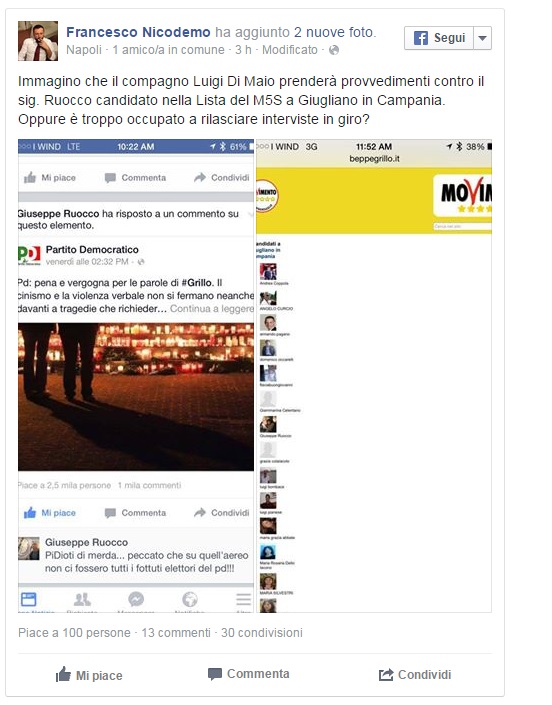 “Immagino – ha commentato su Facebook Francesco Nicodemo pubblicando le foto con ย il commento del grillino – che il compagno Luigi Di Maio prenderร provvedimenti contro il sig. Ruocco candidato nella Lista del M5S a Giugliano in Campania. Oppure รจ troppo occupato a rilasciare interviste in giro?”. Il commento choc di Giuseppe Ruocco รจ sotto un post della pagina Facebook del Partito Democratico in cui si criticava la violenza verbale di Beppe Grillo dopo il post pubblicato sul blog del M5s in cui si paragonava Renzi al copilota della GermanWings.