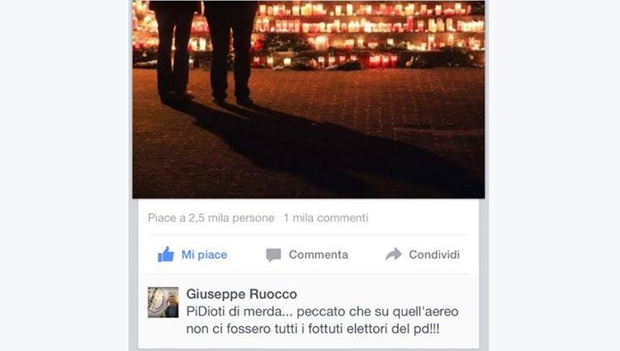 ROMA – “PiDioti di merda… peccato che su quell’aereo non ci fossero tutti i fottuti elettori del pd!!!”: questo il commento choc del grillinoย Giuseppe Ruocco, candidato nella lista M5sย a Giugliano in Campania, pubblicato su Facebook. Commentoย ripreso e segnalato su Facebookย da Francesco Nicodemo, giร responsabile comunicazione del Partito democratico e ora nel team comunicativo di palazzo Chigi.