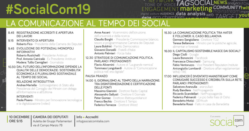 ROMA – SocialCom “La comunicazione al tempo dei Social”, è uno dei più importanti eventi annuali sulla comunicazione digitale, che si svolge dal 2015 alla Camera dei Deputati. L’evento è dedicato alla discussione sull’evoluzione della comunicazione e dell’informazione e del ruolo della rete, nel presente e nel futuro.