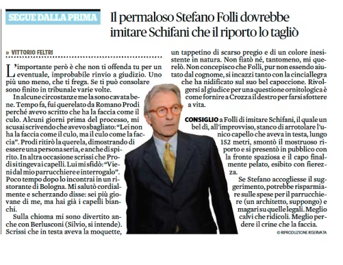 Avvisate Maurizio Belpietro: il nuovo direttore (editoriale, non responsabile) di “Libero” si chiama Vittorio Feltri (ormai non si contano i su e giù tra “Libero” e “Giornale”). Oggi attovagliati al Baretto di Milano in un tavolo riservato brillavano il proprietario di “Libero”, Antonio Angelucci,Vittorio Feltri e Melania Rizzoli che parlavano fitto fitto della questione politica. Infatti la linea di antirenziana e pro Salvini-Meloni di Belpietro è finita al macero. Angelucci è molto vicino (finanziatore?) di Denis Verdini – alla proposta di un contratto di collaborazione Belpietro ha detto no.