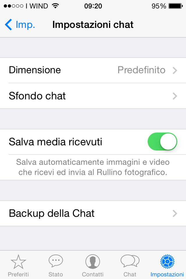 2. Disabilita il download automatico delle foto – Puoi evitare di scaricare milioni di foto che ti inviano i tuoi amici (e che in fondo non ti interessano) andando su Impostazioni > Impostazioni Chat > Auto-download Media > e scegli l’opzione che fa per te (consigliato: quando connesso in Wi-fi)