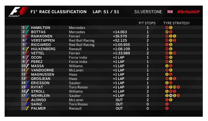 SILVERSTONE (GRAN BRETAGNA) – L’assolo delle Mercedes a Silverstone riapre un Mondiale che probabilmente non era mai stato chiuso. Sullo storico circuito britannico ha vinto Lewis Hamilton (quinto successo casalingo in carriera, come Jim Clark e Alain Prost, quarto consecutivo), scattato dalla pole e poi uscito dalle inquadrature per manifesta superiorità . Sul podio anche Valtteri Bottas con la seconda vettura d’argento, nonostante la partenza dalla nona casella in griglia, causa la sostituzione del cambio. Terzo Kimi Raikkonen ed è l’unico sorriso Ferrari in una corsa dal finale beffardo, che ha relegato Sebastian Vettel al settimo posto.