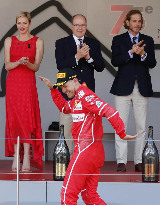 Accanto a lui c’è un raggiante Sebastian Vettel, compagno di squadra alla Ferrari ed arrivato primo malgrado fosse partito per secondo. Vettel ha infatti trionfato grazie alla sosta anticipata del compagno che era ancora davanti. Al rientro, Vettel è diventato imprendibile.