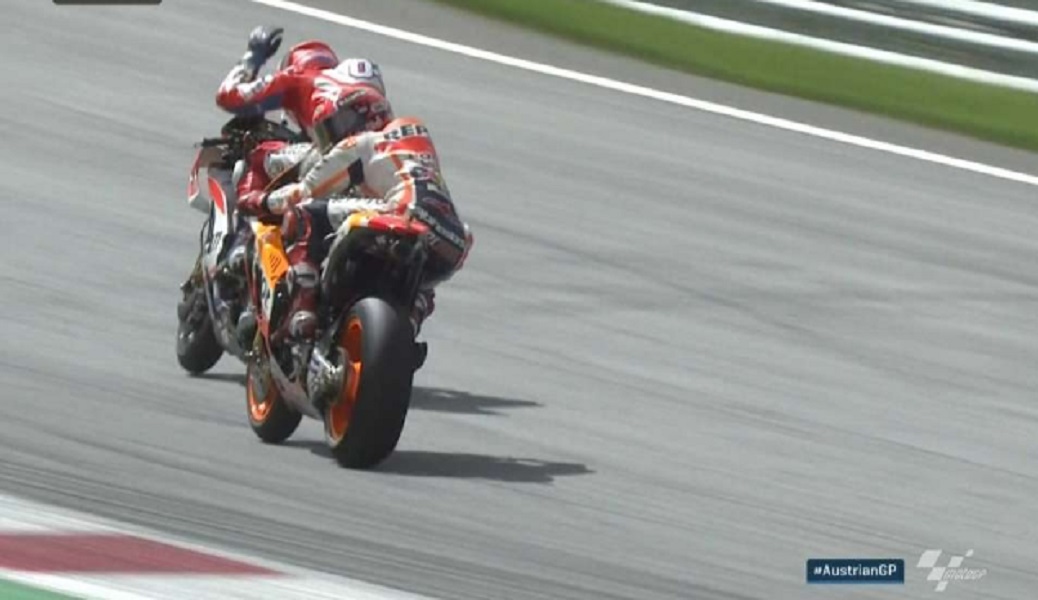 Marquez, per provare a vincere si butta dentro. Dovizioso resiste all’assalto e esce forte dalla curva. Nel testa a testa Dovizioso ha la meglio e va a vincere la gara, non prima di alzare la mano per mandare Marquez a quel paese. Poi a fine gara ha spiegato: