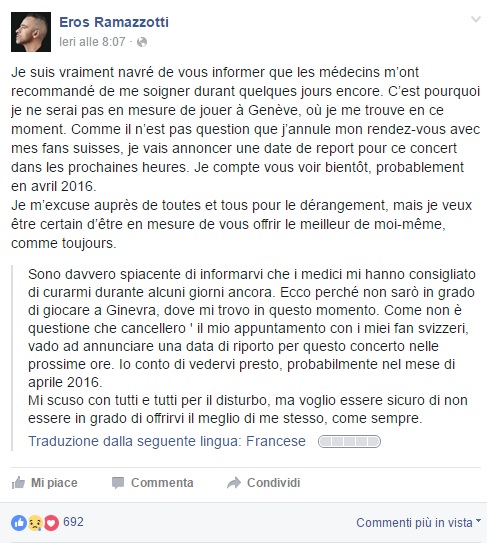 Due giorni dopo Ramazzotti ha dovuto alzare nuovamente bandiera bianca, annullando anche il concerto di Ginevra: “Sono veramente dispiaciuto di dovervi informare che i dottori mi hanno raccomandato di dovermi curare ancora per qualche giorno. – ha scritto – Siccome non ho alcuna intenzione di annullare il mio incontro con i fan svizzeri, annuncerò tra qualche ora un’altra data in cui recupererò il concerto. Spero di vedervi presto, probabilmente il prossimo aprile. Mi scuso con tutte e tutti per il disturbo recato, ma voglio essere sicuro di potervi offrire il meglio di me, come sempre”.