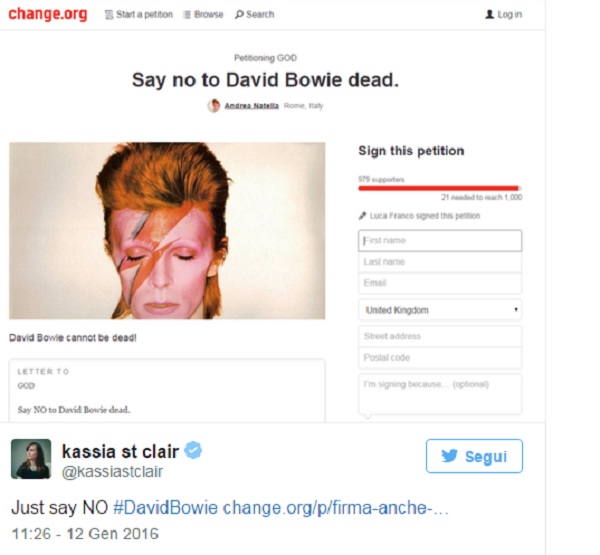 Sara Gandolfi sul Corriere della Sera scrive che Bowie sarebbe morto per un cancro al pancreas e che avrebbe scoperto la malattia nel 2014, ma avrebbe deciso di tenerla nascosta, così come ora è nascosto il suo corpo sconfitto dal male: