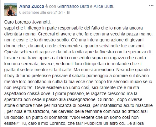 MILANO – “Caro Lorenzo, è colpa tua se non sono ancora nonna”. Così Anna Zucca, mamma di Alice, ha scritto a Jovanotti, in una lettera ironica che ha già fatto il giro del web. La donna infatti ha “accusato” scherzosamente il cantante di rappresentare agli occhi della figlia e di migliaia di ragazze, l’incarnazione dell’uomo perfetto. Giovani donne che trascorrono la vita pensando: “Deve esistere un uomo così, sicuramente c’è e mi sta aspettando chissà dove. I giorni passano, le ragazze crescono ma la speranza non cede il passo alla rassegnazione”