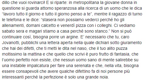 “E’ necessario che tu, caro Jovanotti, pubblichi una lettera aperta nella quale dichiari sotto giuramento che hai dei difetti, che ti metti le dita nel naso, che il tuo alito puzza moltissimo la mattina e che quello che scrivi è puro frutto di fantasia, che l’uomo perfetto non esiste, che nessun uomo sano di mente salirebbe su una instabile impalcatura per fare una serenata e che, nella vita, bisogna essere consapevoli che avere qualche difettino fa di noi persone più interessanti perché la perfezione è solo una grande noia”.