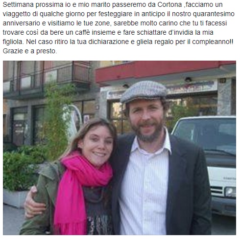 La lettera si chiude con un invito: la prossima settimana la mamma sarà in viaggio col marito a Cortona per festeggiare 40 anni di matrimonio e ha chiesto al cantante di incontrarla per un caffè e “fare schiattare di invidia la mia figliola”. Chissà se Jovanotti risponderà alla originalissima lettera della mamma che, intanto, ha pubblicato un nuovo aggiornamento, citando una nota pubblicità, finita al centro di accesi dibattiti: “Possa un asteroide colpirmi se non posto la foto con Lorenzo a Cortona“.