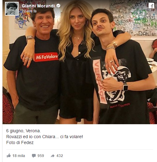 Da bravo veterano, Morandi ha protetto il giovane compagno di lavoro con cui duetta nel singolo di successo “Volare”, e si è assunto tutte le colpe di una performance da dimenticare che ha attirato una pioggia di critiche. La risposta è apparsa sotto un commento a una foto, che ritrae lo youtuber e Morandi in compagnia di Chiara Ferragni, la compagnia di Fedez. La foto l’ha scattata lo stesso Fedez.
