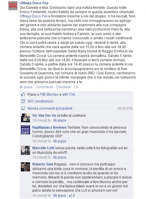 “Qui Daniele e Max. Dobbiamo darvi una notizia terribile. Questa notte Enrico Fontanelli, nostro fratello da sempre in questa avventura chiamata Offlaga Disco Pax e fondatore insieme a noi del gruppo, ci ha lasciati. Non stava bene da qualche tempo, ma certo non immaginavamo un epilogo del genere e non abbiamo parole per esprimere alla sua compagna Elena, alla sua bellissima bambina Leila nata pochissimi mesi fa, alla sua famiglia, ai suoi fratelli Andrea e Fabrizio, ai suoi amici e alle tantissime persone che lo hanno conosciuto e amato i nostri sentimenti. Chi lo vorrà potrà venire a dargli un saluto oggi, Venerdì 4 Aprile, alla camera ardente che sarà aperta dalle ore 15,00 e fino alle ore 18,00 presso l’obitorio dell’ospedale Santa Maria Nuova di Reggio Emilia in via Benedetto Croce. La camera ardente riaprirà domattina, Sabato 5 Aprile, dalle ore 8,00 fino alle ore 14,45. Il funerale si terrà sempre domani, Sabato 5 Aprile, a partire dalle ore 14,45 presso la camera ardente in via Benedetto Croce, da dove lo accompagneremo poi al cimitero di San Giovanni di Querciola, nel comune di Viano (RE). Ciao Enrico, cercheremo di onorare ogni giorno le infinite meraviglie che ci hai donato nei bellissimi anni che abbiamo passato insieme a te”.