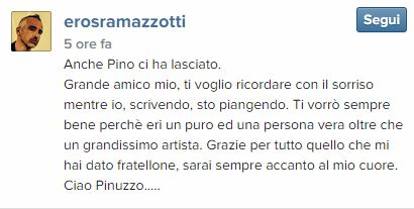 “Anche Pino ci ha lasciato. Grande amico mio, ti voglio ricordare con il sorriso mentre io, scrivendo, sto piangendo. Ti vorrรฒ sempre bene perchรฉ eri un puro ed una persona vera oltre che un grandissimo artista. Grazie per tutto quello che mi hai dato fratellone, sarai sempre accanto al mio cuore. Ciao Pinuzzo”.
