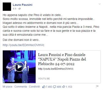 “Alla tua famiglia e ai tuoi figli, il mio pensiero e il mio abbraccio. A noi tuoi fan rimani per sempre tu Pino Daniele. Con la tua arte unica. E questa foto, con la mia testa sulla tua spalla per dirti grazie. Per avermi permesso di conoscerti da vicino. Per cantare con te e per te”.