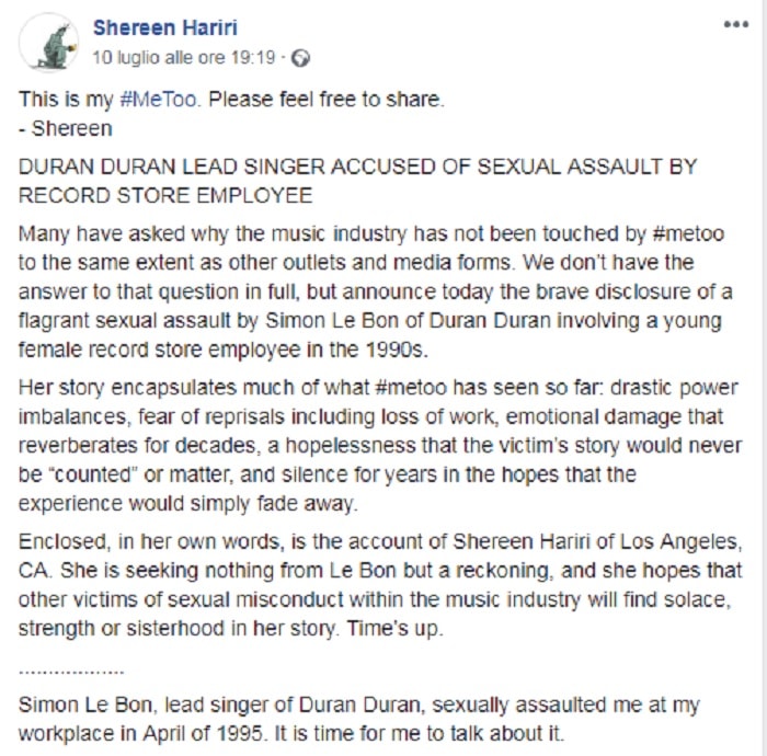 Shereen ha raccontato la vicenda in un post su Facebook poi condiviso anche su Twitter: “Questo è il mio #MeToo. Simon Le Bon, leader dei Duran Duran mi ha aggredita sul mio posto di lavoro nell’aprile del 1995″.