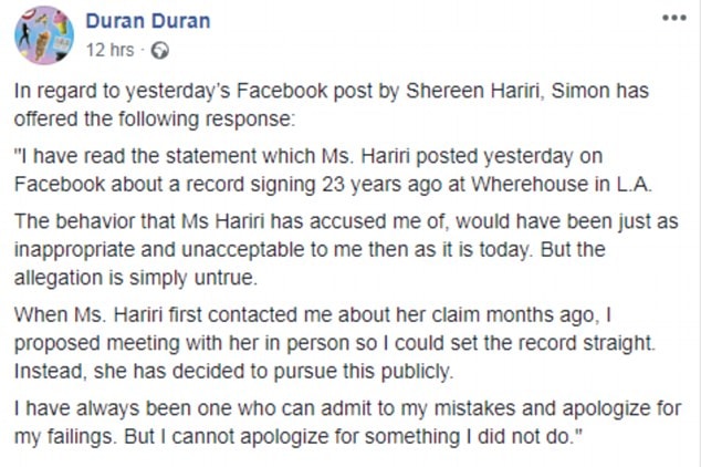La risposta del frontman dei Duran Duran è arrivata subito. Simon Le Bon ha infatti scritto un post sulla pagina Facebook del gruppo dichiarando che l’accusa è falsa: “Quando ho proposto alla signora Hariri di incontrarci e chiarirci ha declinato il mio invito e adesso ha scritto questo post. Non posso scusarmi di qualcosa che non ho fatto”.